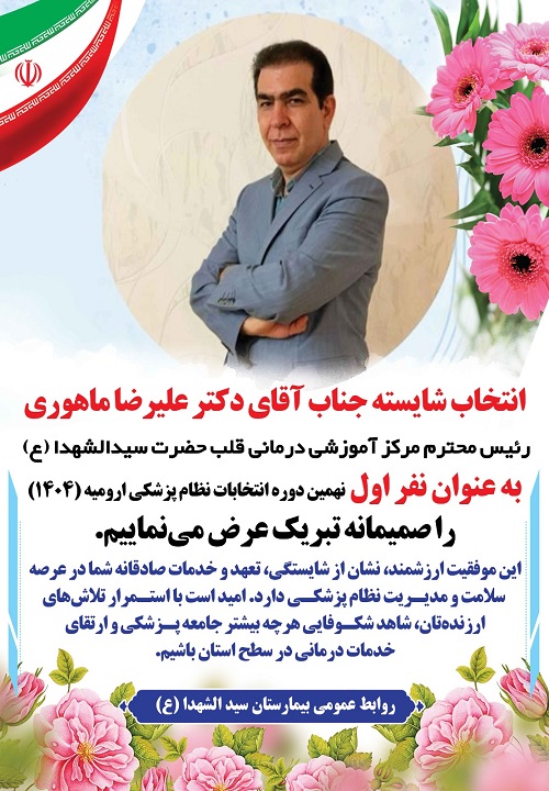 تبریک مدیر مرکز آموزشی درمانی قلب حضرت سیدالشهداء(ع) به آقای دکتر ماهوری ریاست مرکز بعنوان نفر اول نهمین دوره انتخابات نظام پزشکی ارومیه(1404) :