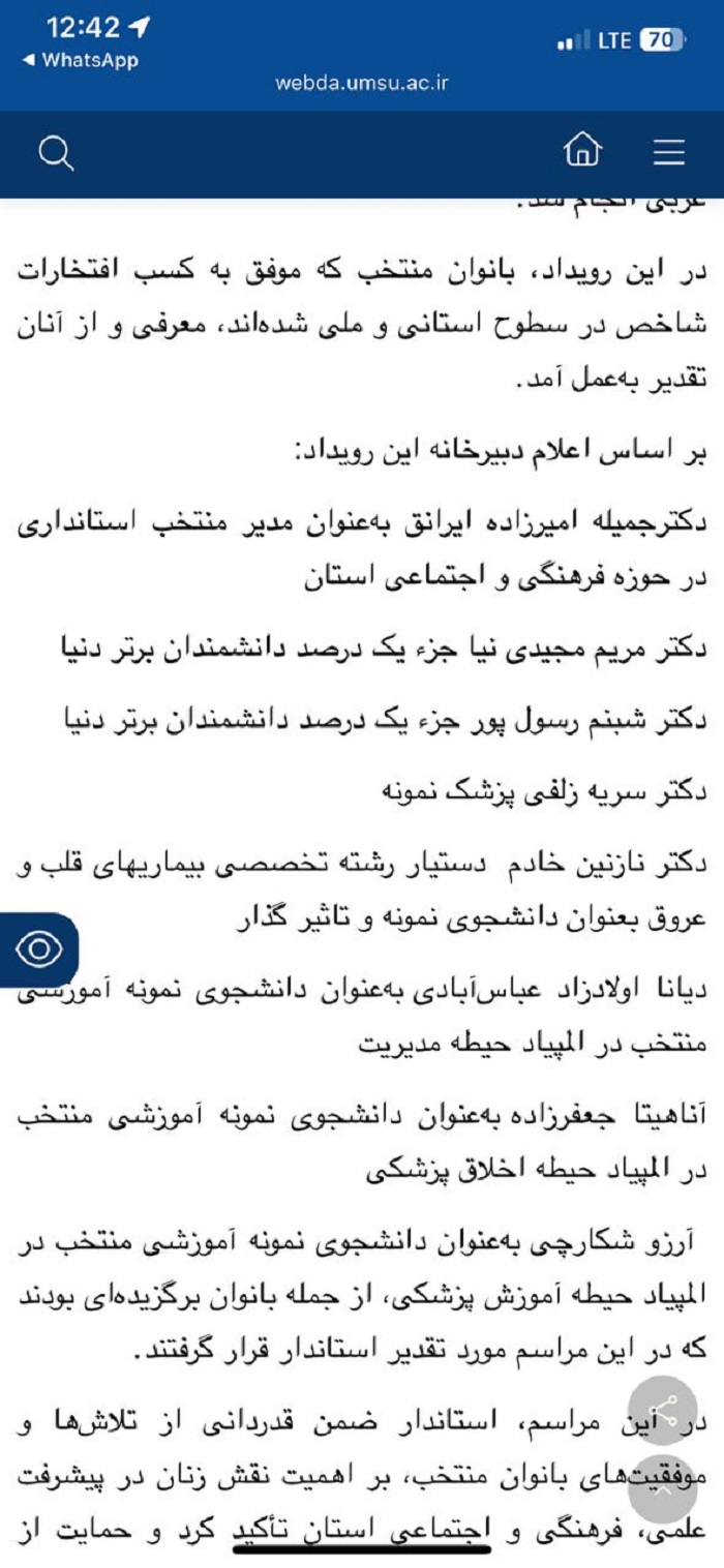 در حوزه سلامت،دکتر نازنین خادم ،رزیدنت قلب و عروق مرکز آموزشی درمانی قلب حضرت سیدالشهداء(ع) در حوزه های علمی،پژوهشی و فرهنگی برگزیده شد و مورد تقدیر قرار گرفت.