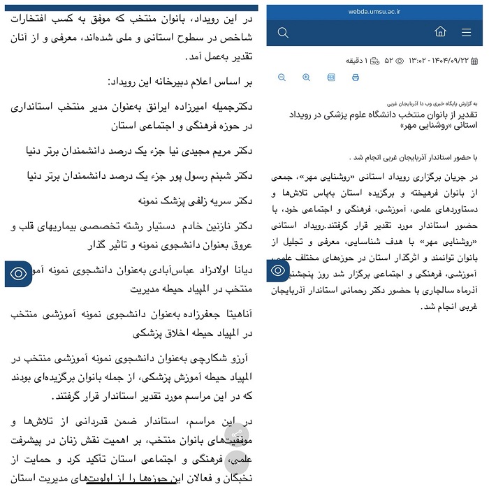 روز پنجشنبه 20 آذرماه سالجاری رویداد استانی"روشنای مهر" و آیین تجلیل از بانوان تاثیرگذار استان آذربایجانغربی با حضور دکتر رحمانی استاندار آذربایجانغربی و جمعی از نمایندگان و مسولان استانی بمناسبت گرامیداشت میلاد با سعادت حضرت فاطمه زهرا(س) و روز مادر و زن در تالار وحدت ارومیه برگزار شد.